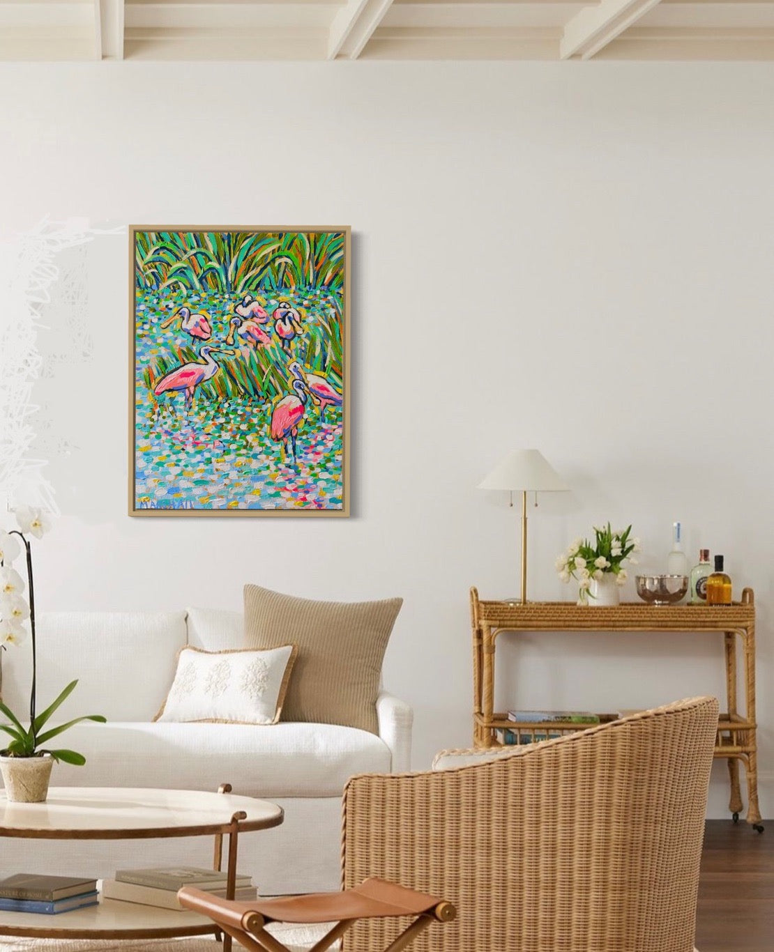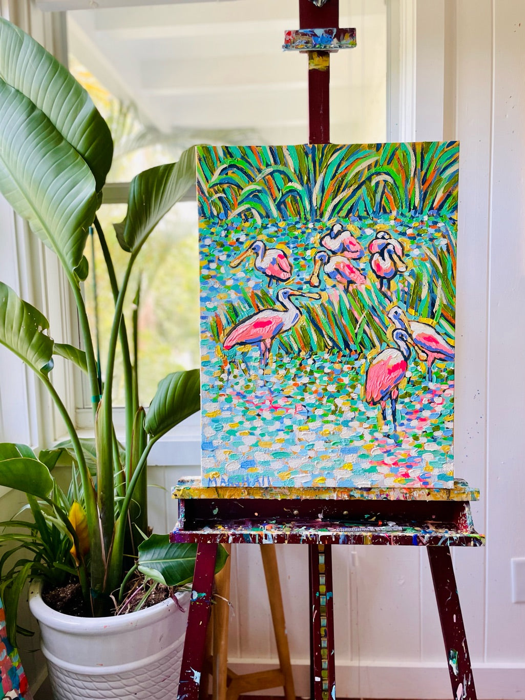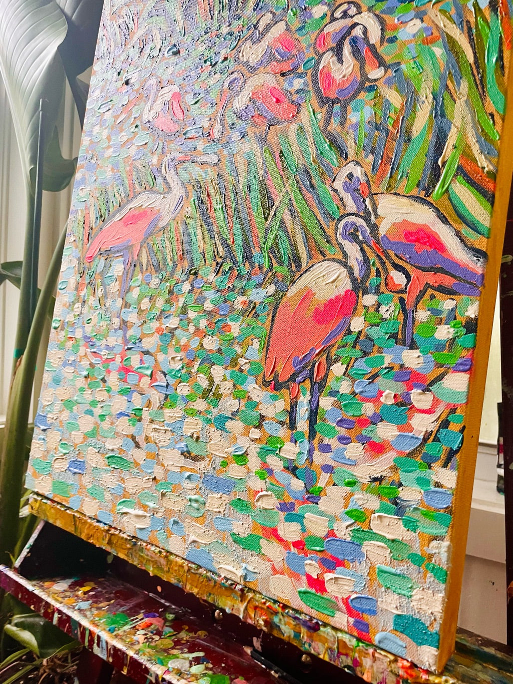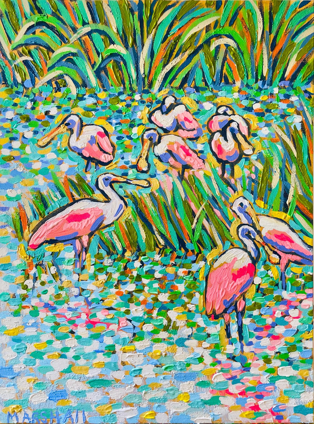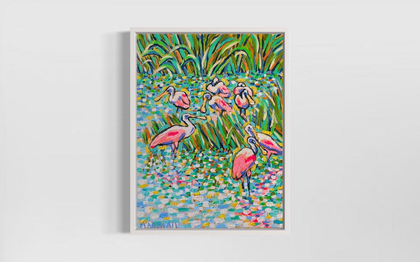 A "bowl" of roseate spoonbills gather in the shallow wetlands, their wings rendered in bold, sculptural palette-knife strokes that build incredible texture and catch the light from every angle. Each sweeping gesture is packed with intricate detail and vibrant pinks that practically vibrate against the cool heavens — a dramatic, textural triumph of movement and coastal color. Signed original, one-of-a-kind.